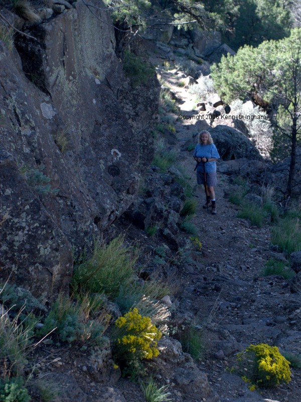 From Taos, head north on NM 522 (this highway starts out as US 64, but on the north edge of Taos, 64 goes left and 522 continues north). Between mile markers 15 and 16 you will see a sign about Forest Road 9 and Cebolla Mesa. Take Forest road 9 west (left) about 4 miles to the Cebolla Mesa campground. At the campground, the road splits. Take the left branch to the trailhead. There is no sign along the road to indicate you have arrived at the campground. See the Cebolla Mesa campground web site for a photo of the campground entrance. When we visited, the road had ruts indicating that it becomes slick and muddy when wet. | ![]() |